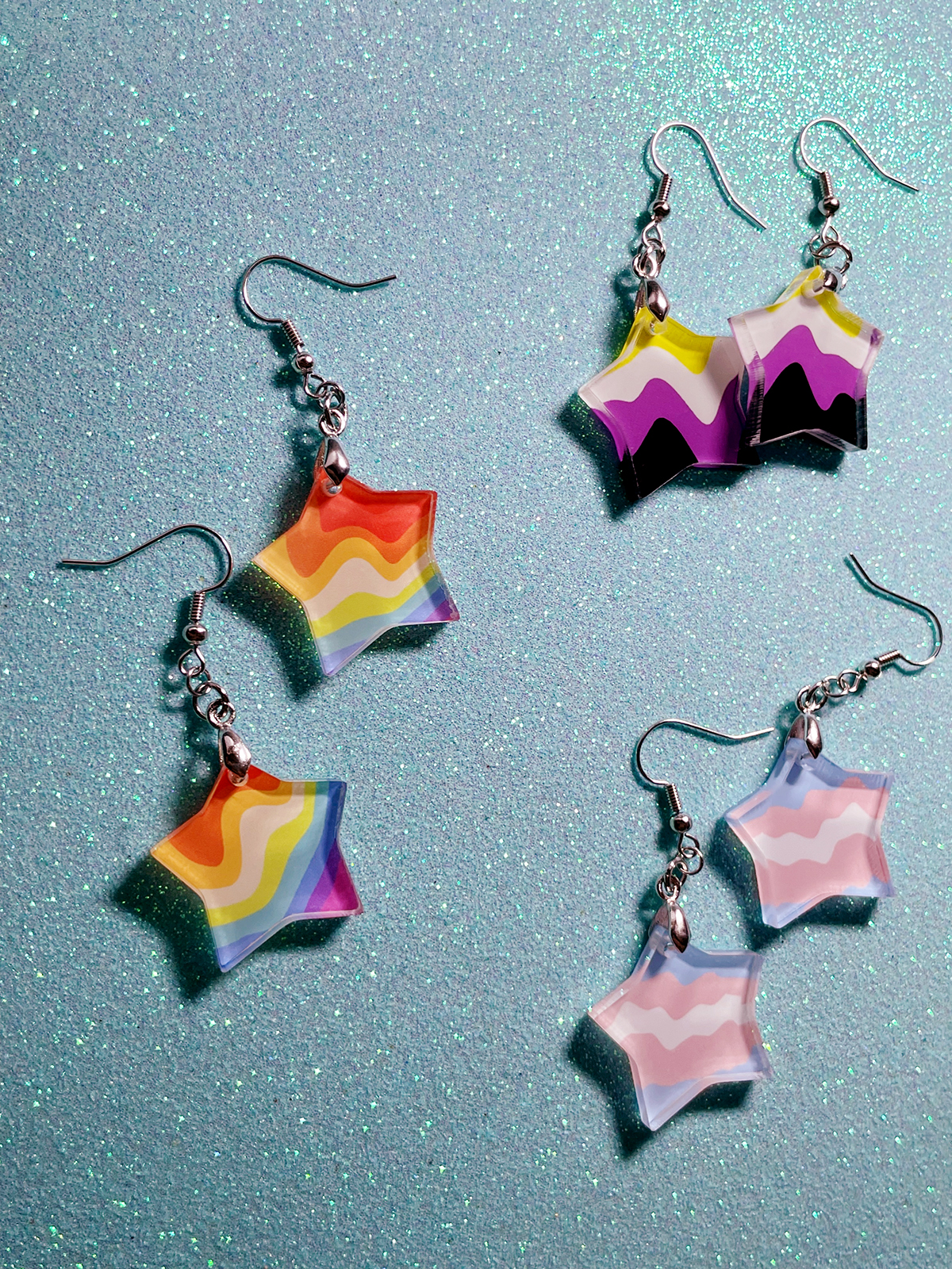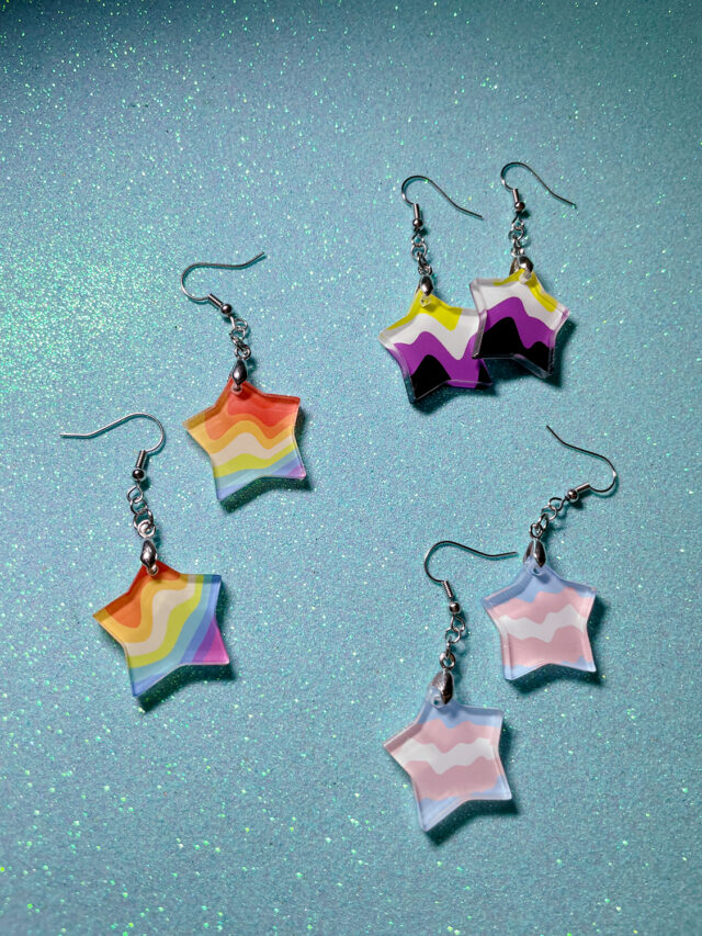 Queer made retro acrylic star shaped earrings with the vibrant colors of your LGBTQ+ flag. Crafted using hypoallergenic silver tone fish hooks, these dangly stae earrings pair measures 40mm aprox…