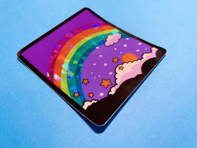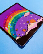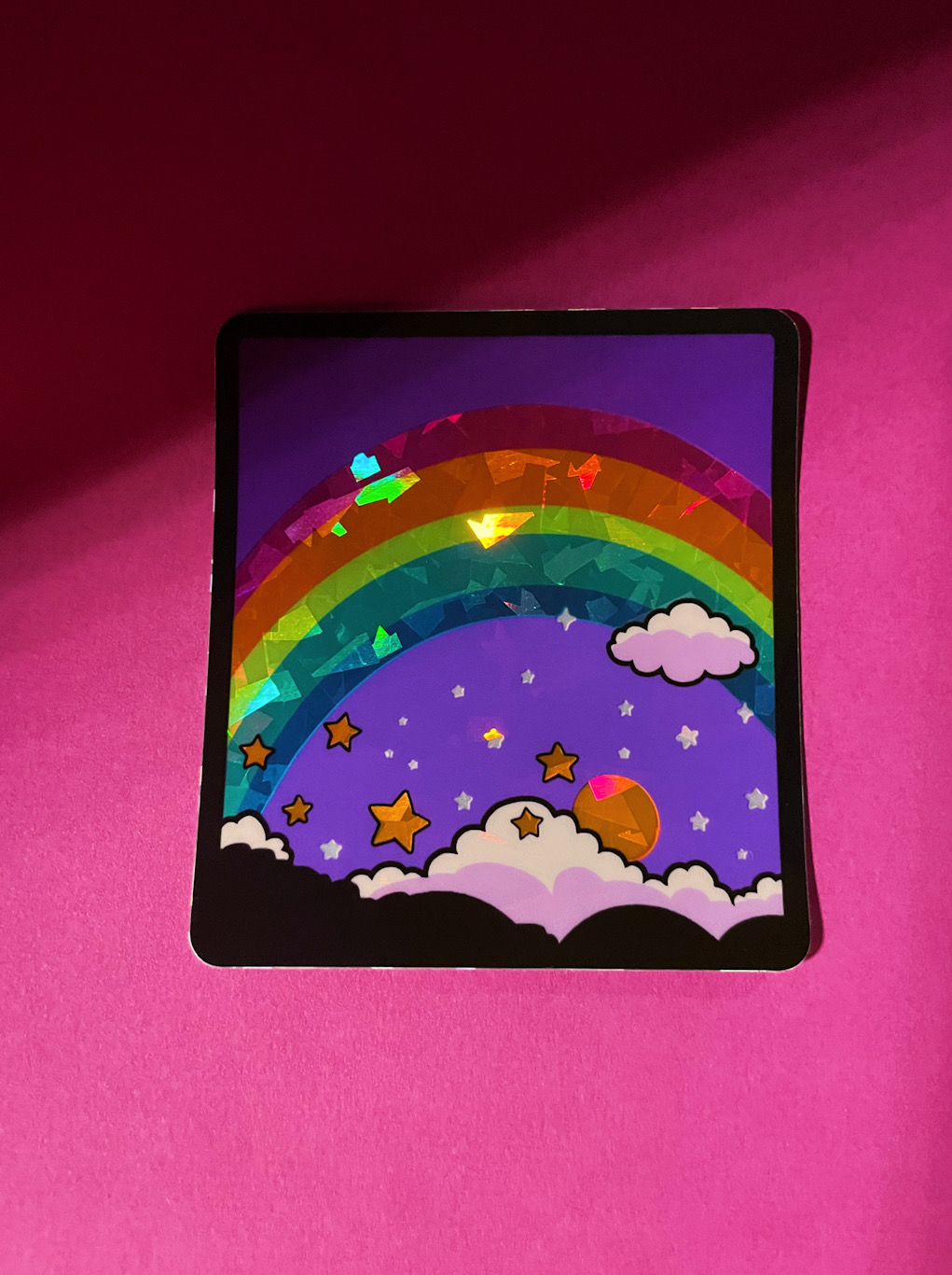 Introducing Rainbow Skies – a burst of vibrant colors that will instantly brighten your day! This 3″ waterproof vinyl sticker features a colorful holographic effect on a rainbow, sun, and stars, perfect for adding a touch of rainbowcore inspired flair to your belongings. Whether you’re looking for a subtle pride sticker or simply love all things colorful, this Rainbow Skies sticker is sure to bring a smile to your face wherever you choose to place it. Brighten up your day with this joyful and eye-catching addition to your collection!